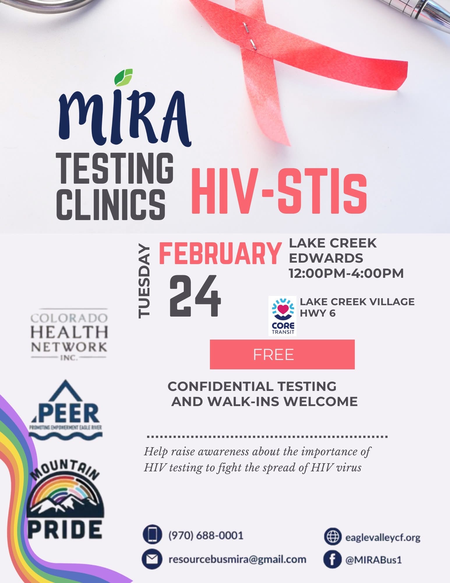 Join Colorado Health Network, MIRA Bus, Promoting Empowerment Eagle River (PEER), and Mountain Pride on Tuesday, February 24 for a Free HIV & STD Testing Clinic at Lake Creek Village, Edwards.
